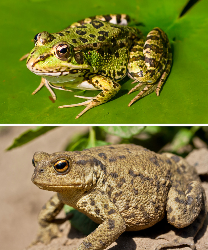 A békák és a varangyok jelentős különbségeket mutatnak annak ellenére, hogy kétéltűek és sok hasonlóságot mutatnak. A békák jellemzően hosszú lábakkal rendelkeznek, miközben életük jelentős részét vízben vagy víz közelében töltik, ami nedves bőrt eredményez. Ezzel szemben a varangyoknak rövidebb lábuk van, és elsősorban a szárazföldön élnek, ami száraz és göcsörtös bőrt eredményez.