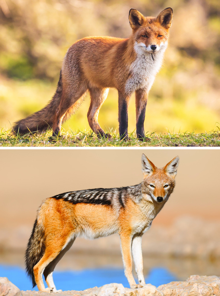 Bár a róka és a sakál első pillantásra hasonlítanak egymásra, mégis jelentős különbségek vannak közöttük. A róka háromszögletű fülekkel, hegyes és kissé felfelé fordított pofával, viszonylag rövid végtagokkal és hosszú, bolyhos farokkal büszkélkedhet. Ezzel szemben a feketehátú sakál hosszabb testtel, hosszú lábakkal és nagy fülekkel rendelkezik. A legfontosabb különbség azonban a sakál bundáját díszítő fekete nyeregben rejlik, amely a hátán húzódik végig, és a sakál jellegzetes vonása.