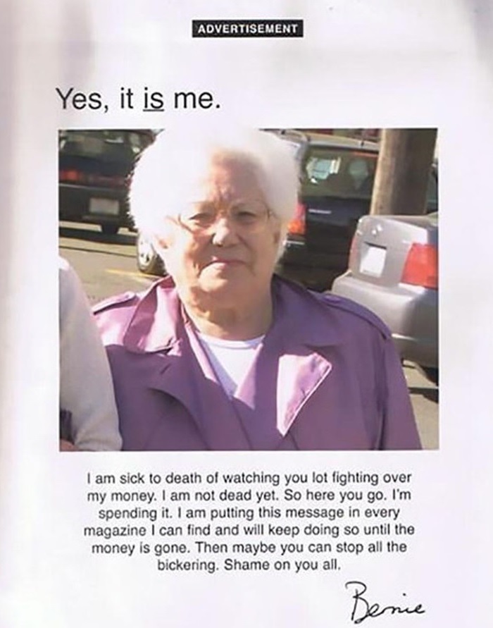 9. Egy nagymama így üzent a családjának újsághirdetésben: „Elegem van abból, hogy azon marakodtok, ki örököl, pedig még élek. Ezért inkább az összes pénzemet erre a hirdetésre költöm. Szégyelljétek magatokat.”