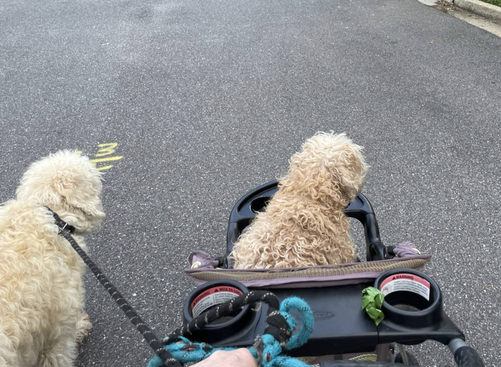 „Így sétáltatom a kutyáimat. A kocsiban ülő már 17 éves, muszáj őt tolni.”
