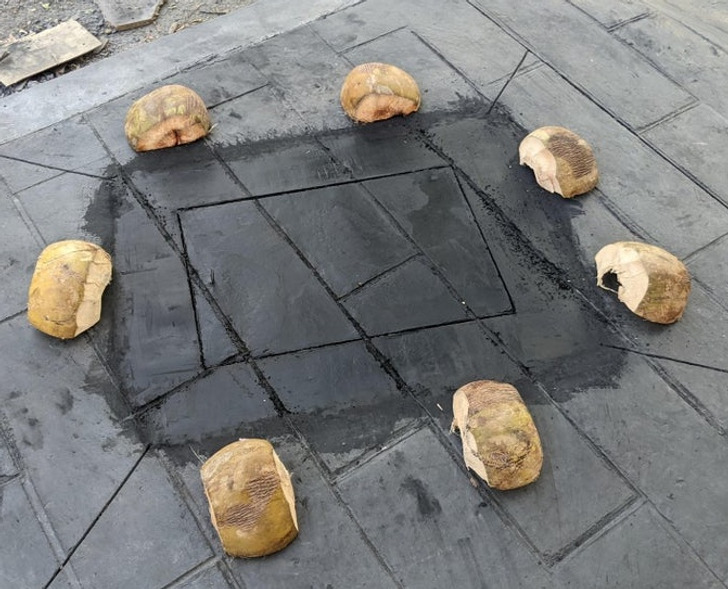 Kókuszdióval rakták körbe a friss betont.