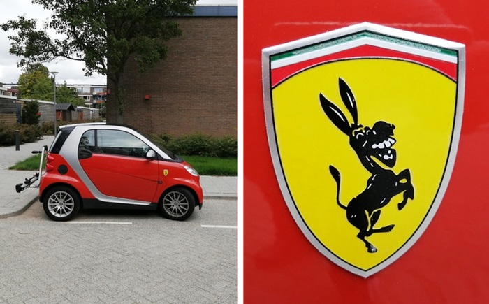 15. A minap sétálás közben megpillantottam egy kis tűzpirosra festett smartot, amin egy ismerős logót véltem felfedezni, aztán jót nevettem, amikor közelebbről is szemügyre vettem.
