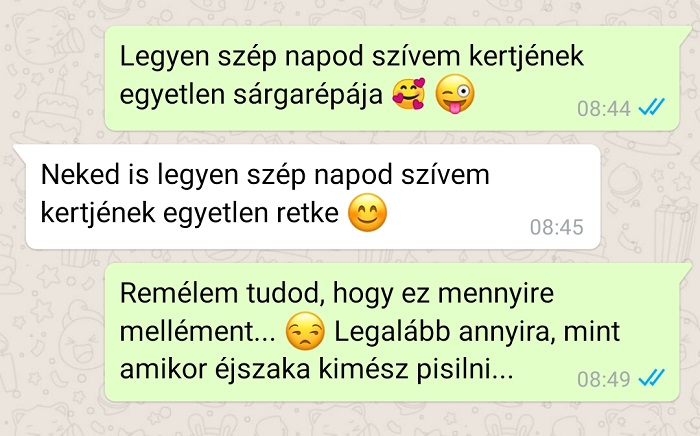 4. Este megkérdeztem tőle, hogy hagyott-e sonkát reggelire. Biztos válasza mindig: „Persze, drágám.” — majd reggelre nyoma vész.