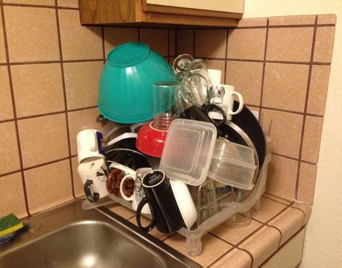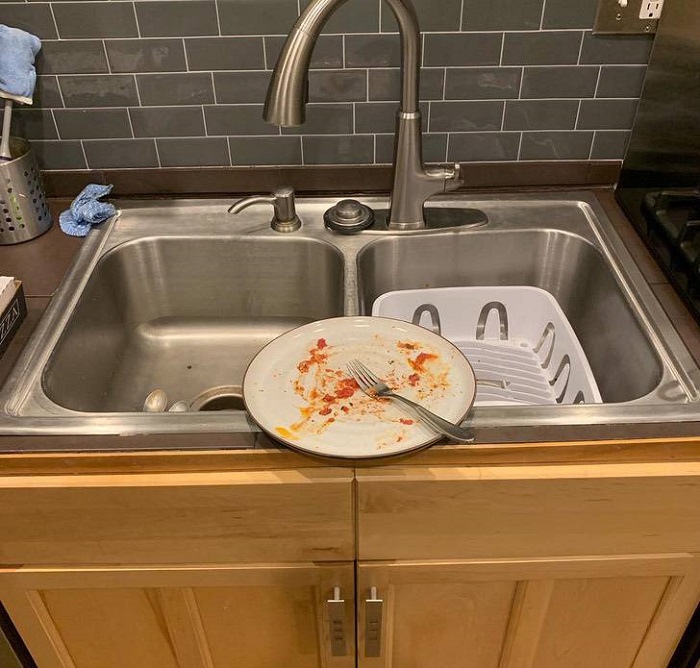 5. A tányér elhelyezése vacsora után: ő minden alkalommal a mosogató szélére teszi. Lehetne a mosogatóban, a mosogatógépben, vagy egyszerűen a pulton — ő ragaszkodik a széléhez.