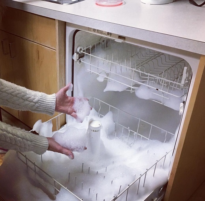 11. Elfogyott a mosogatógép-tabletta, ezért a férjem kreatívan oldotta meg: mosogatószerrel töltötte meg a gépet. (Nem javasolt megoldás.)