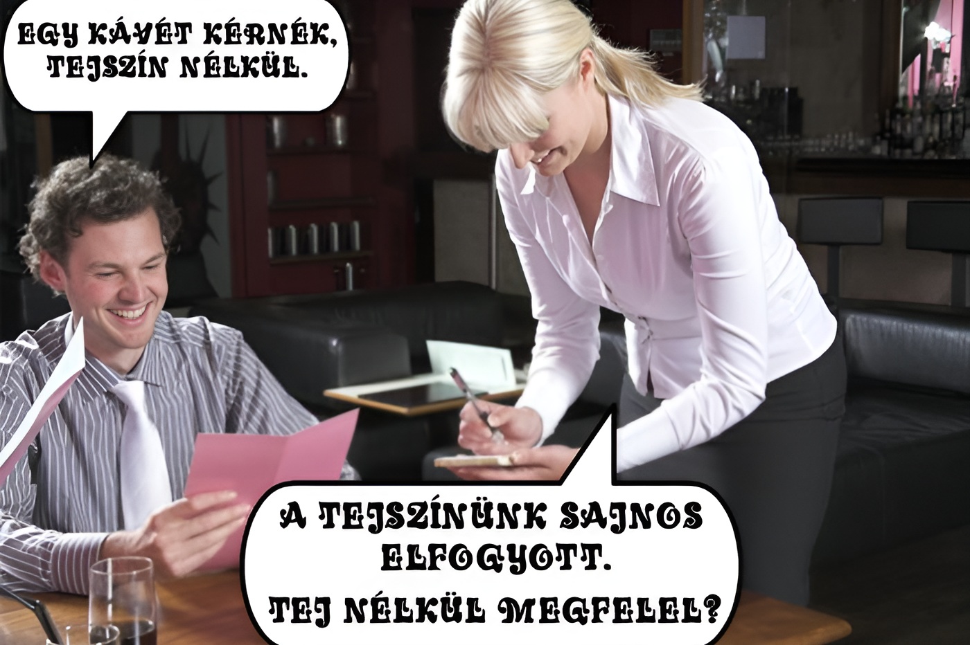 – Asszonyom, sok jó kávét ittam már, de ilyen finomat még soha! – mondja elismerően a férfi.