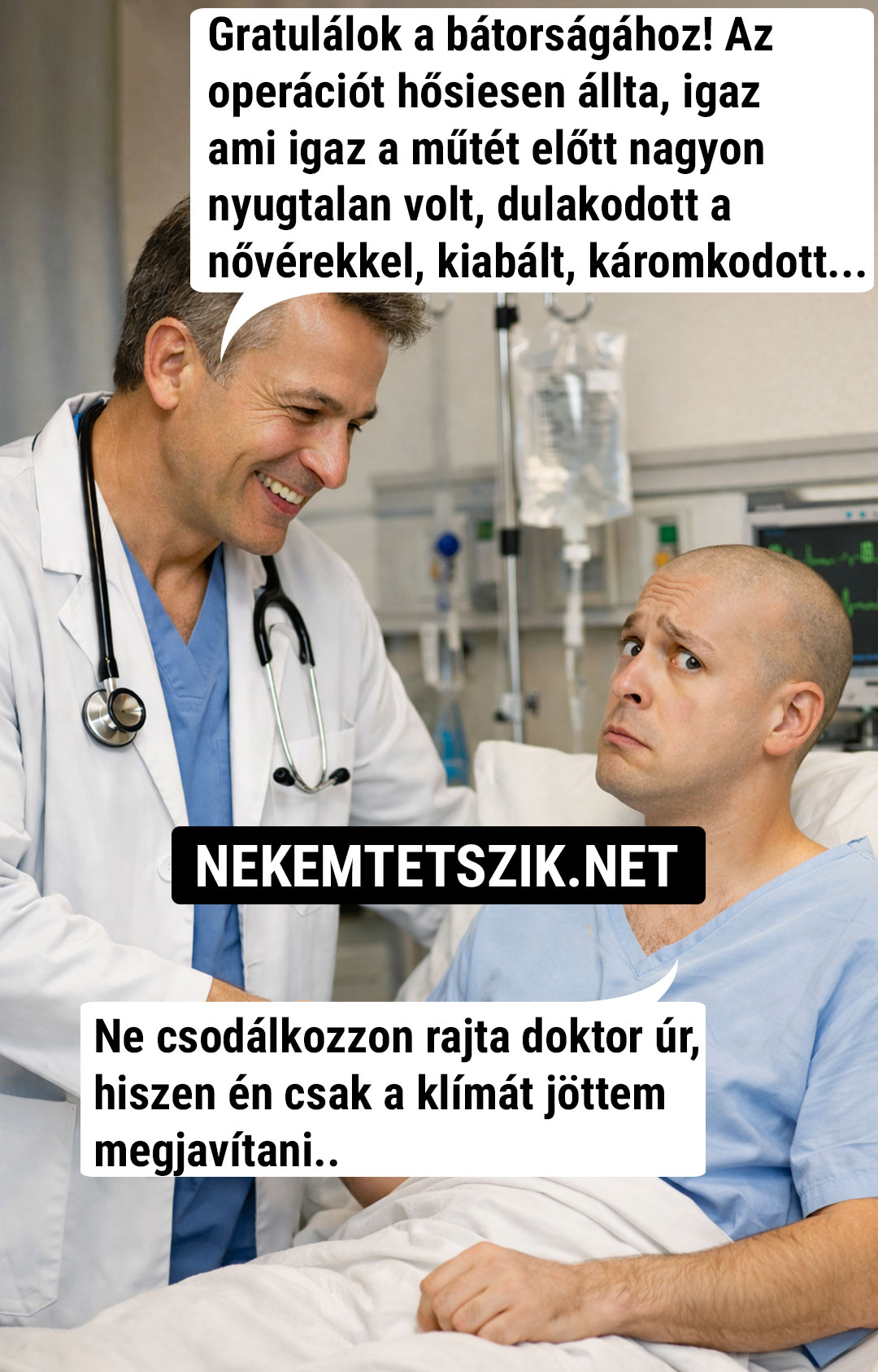 – Doktor úr, én antialkoholista vagyok. Egy kortyot sem iszom – válaszolja a beteg nyugodtan.