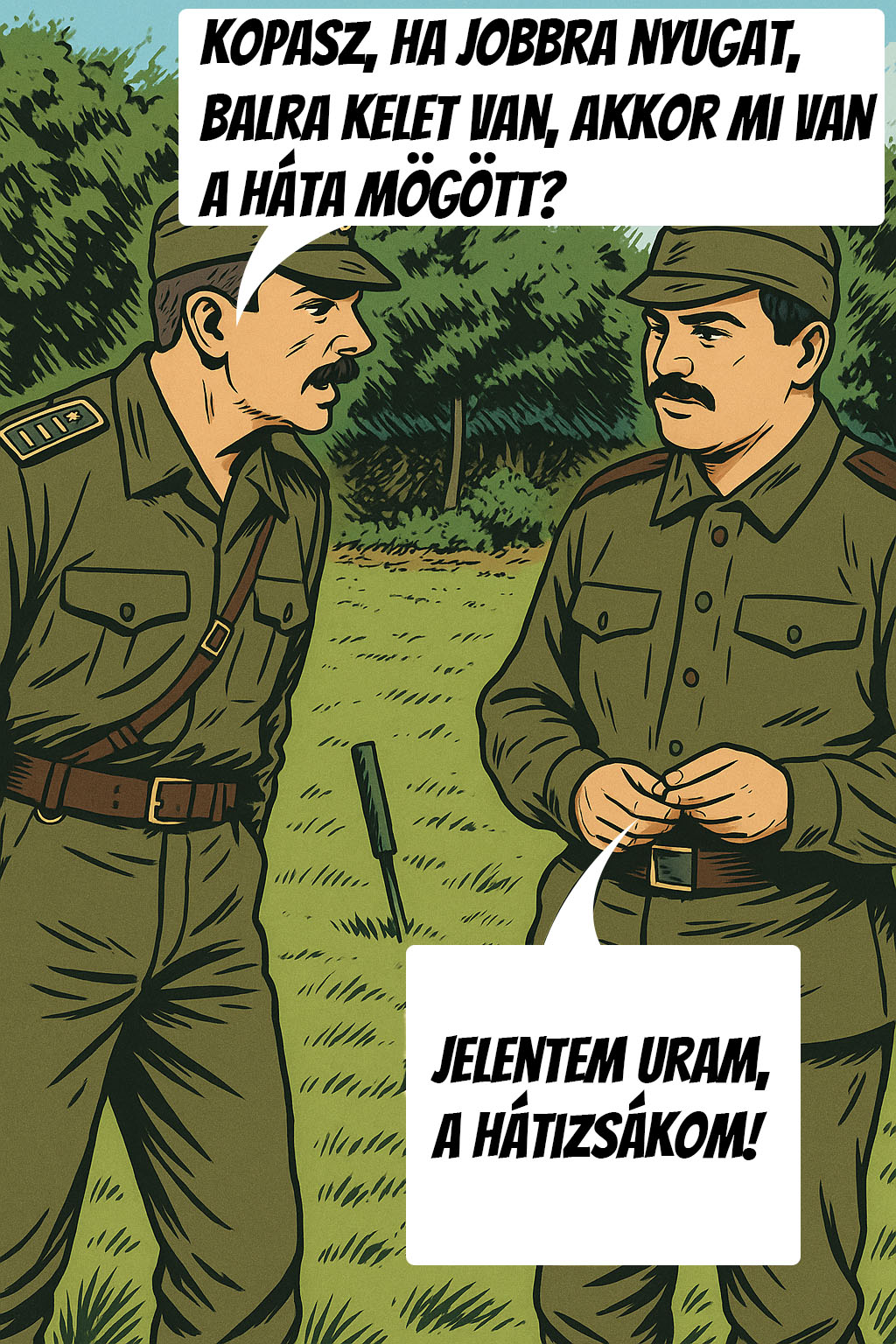 – Szóval, Kovács honvéd – kezdi az őrmester –, maga megszületik, felnő, aztán egyszer csak meghal. Eltemetik. Kinő a sírján egy szál fű. Arra jön egy tehén, lelegeli. Kicsit később letesz egy szép nagy lepényt. Én meg jövök, belelépek, ránézek, és azt mondom: „Kovács honvéd, maga de megváltozott!”