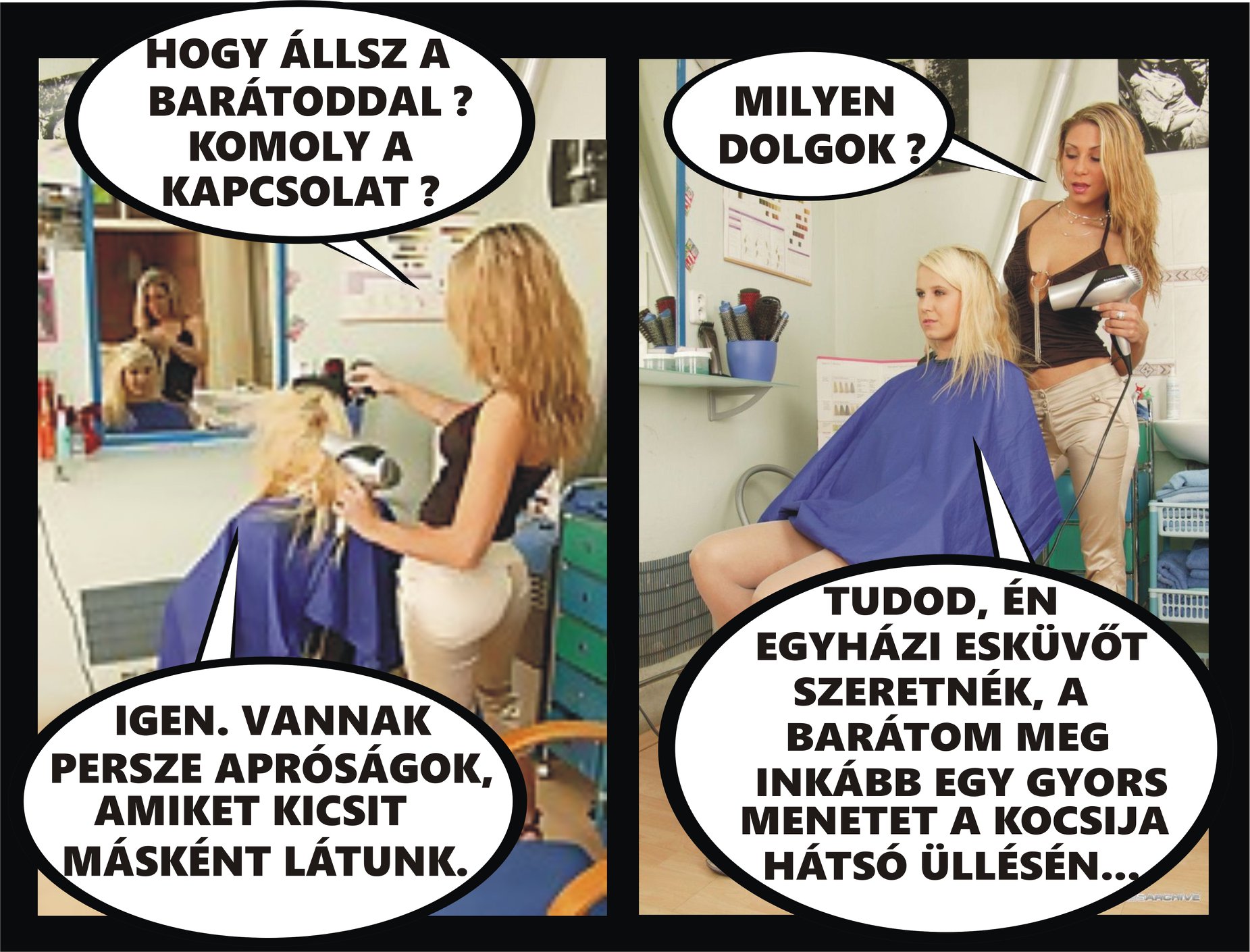 – Még mindig szeretjük egymást, és szeretnénk összeházasodni! – mondja a fiú. – De azt azért megkérdezném, ha mégsem sikerül a házasság, ugye elválhatunk?