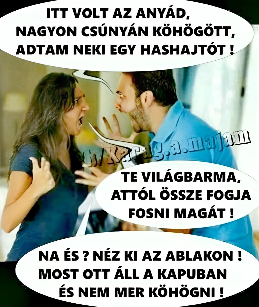 – Hogyhogy és? Nézzétek meg az anyósomat: lebarnult a nyelve…