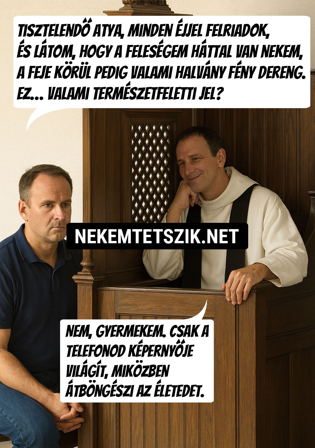 A pap sóhajt egyet, kicsit megtámaszkodik, majd komoly hangon kimondja a penitenciát:
